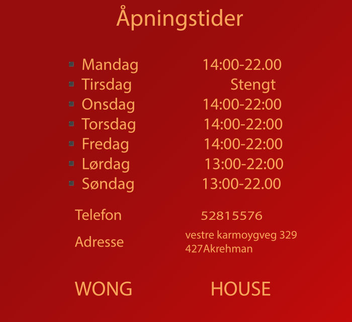 Kontakt & Åpningstid Åpningstider hos Wong House Velkommen til Wong House! Vi gleder oss til å servere deg autentiske asiatiske retter til alle dagens måltider. Vennligst merk våre åpningstider her, og planlegg ditt besøk for en smakfull opplevelse hos oss Ring for å bestille