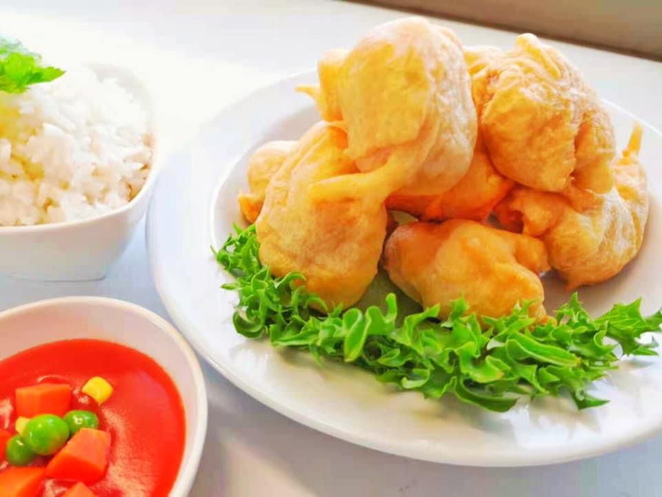 Innbakt kylling, innbakt scampi, innbakt svinekjøtt og ris med sursøtsaus (hvete, skalldyr, sulfitt)