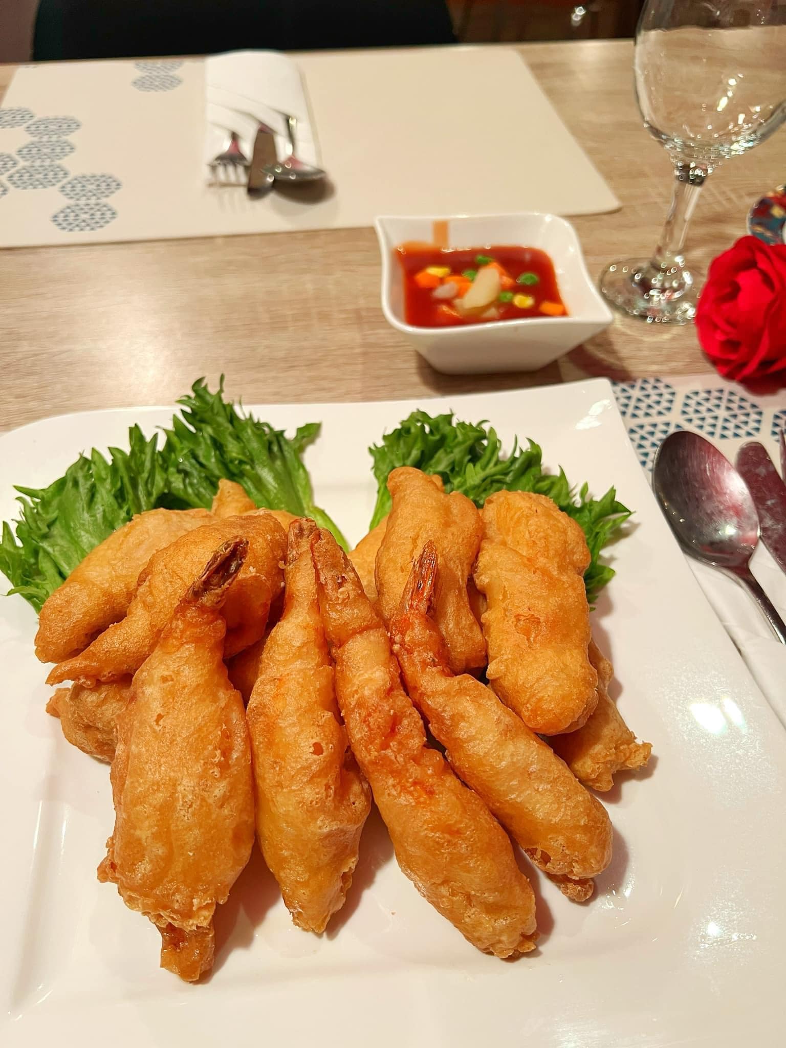 Innbakt scampi, innbakt and og ris med sursøtsaus (hvete, skalldyr, sulfitt)
